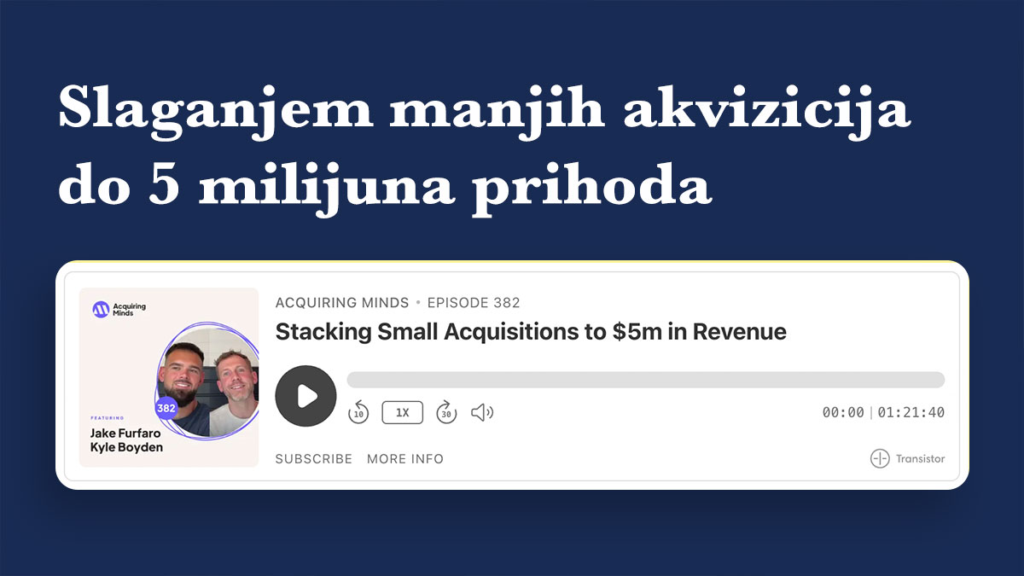 U podcastu Acquiring Minds objavljena je epizoda pod nazivom “Stacking Small Acquisitions to $5m in Revenue” u kojoj Kyle Boyden i Jake Furfaro, osnivači tvrtke Rainier Cleaning Solutions, objašnjavaju svoj neobičan, ali vrlo uspješan put rasta. Njihova priča započela je kupnjom malih tvrtki za čišćenje u Seattleu, s prihodima od 300 do 500 tisuća dolara, i to gotovo bez vlastitog kapitala. Ključ njihove strategije bio je dogovor sprodavateljima da im se cijena isplati kroz buduće prihode, što je poznato kao seller financing.
