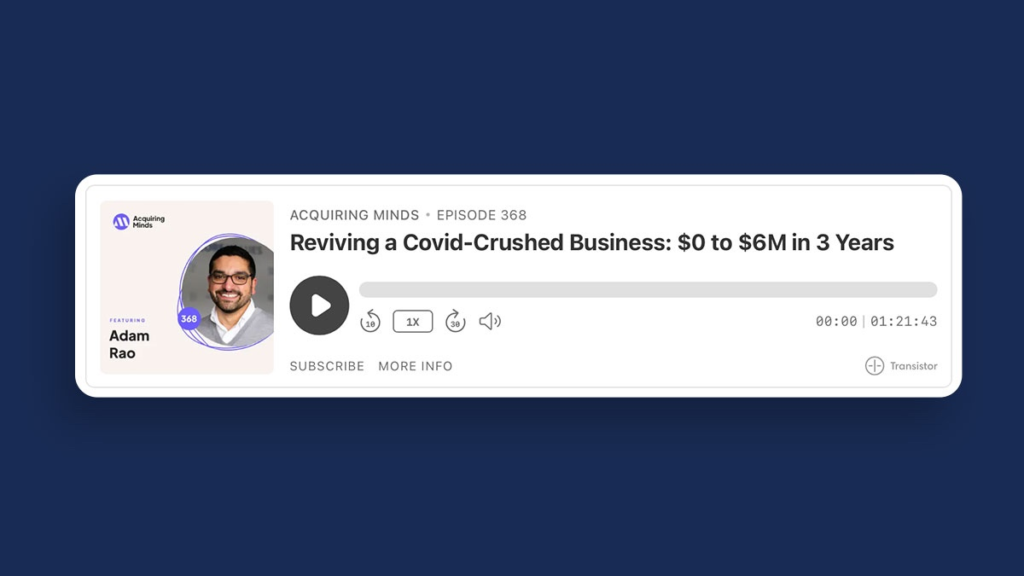 U epizodi “Reviving a Covid-Crushed Business: 0 to $6M in 3 Years” podcasta Acquiring Minds, Adam Rao govori o svom putu preuzimanja i transformacije tvrtke Triple20, koja je tijekom pandemije ostala potpuno bez prihoda. Posao je bio paraliziran više od godinu dana, a mnogi bi u takvoj situaciji jednostavno odustali. Adam je, međutim, prepoznao priliku da uz dobru strukturu financiranja i jasnu viziju stvori novi početak.