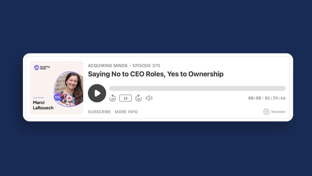 U epizodi “Saying No to CEO Roles, Yes to Ownership” podcasta Acquiring Minds, Marci LaRouech razgovara o svojoj odluci nakon uspješno vođenog HR poduzeća koje je prodala, u kojemu su je ulagači i bankari pozivali da prihvati nove CEO izazove i ponovi uspjeh. No Marci je imala sasvim drugačiji cilj — željela je raditi po vlastitim pravilima i vlastitim tempom. Umjesto da prihvati pozamašnu ulogu, odlučila je pronaći nešto što će joj dati kontrolu i fleksibilnost — i pronašla je idealnu priliku.